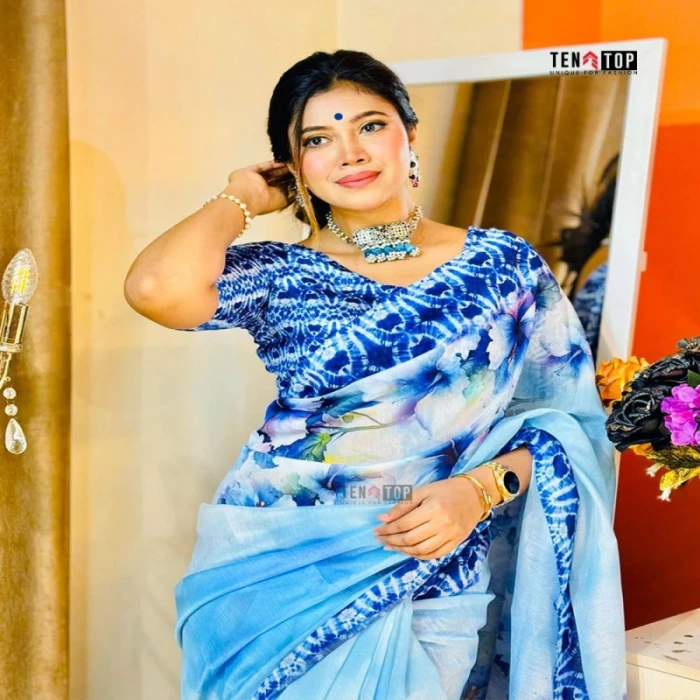 ডিজাইন: ডিজিটাল ফ্লোরাল প্রিন্ট ও নীল বর্ডার