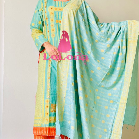 Stitched Three Piece Code T-3007 স্লাব কটন থ্রিপিস । গলার ডিজাইন ও পুরো বডিতে স্ক্রিনপ্রিন্টের কাজ করা। প্রতিটি থ্রিপিস সুন্দর ডিজাইনের এবং বানানো কামিজঃ সাইজ ঃ ৩৮,৪০=XL এবং ৪২,৪৪= XXL লং ৪৫ ইঞ্চি