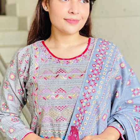 Stitched Three Piece Code T-3010 স্লাব কটন থ্রিপিস । গলার ডিজাইন ও পুরো বডিতে স্ক্রিনপ্রিন্টের কাজ করা। প্রতিটি থ্রিপিস সুন্দর ডিজাইনের এবং বানানো কামিজঃ সাইজ ঃ ৩৮,৪০=XL এবং ৪২,৪৪= XXL লং ৪৫ ইঞ্চি