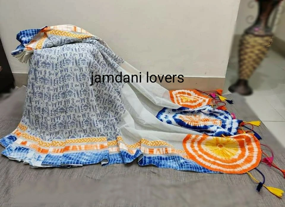 কটন কোটা শাড়িতে স্কিন প্রিন্ট করা সাথে পাড় ও আঁচলে টাই ডাই প্যাচ ওয়ার্ক করা