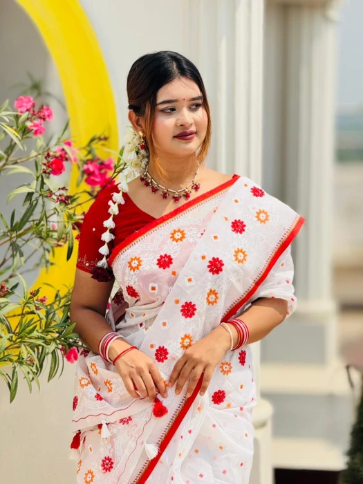 পুরো শাড়িতে আকর্ষণীয় ব্লক প্রিন্ট এবং এমবোডারি সাথে ডলারের কাজ করা।