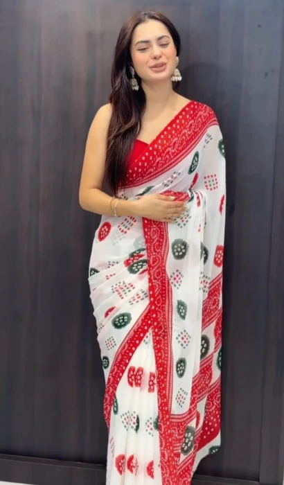 জর্জেট শাড়ি, ডিজিটাল প্রিন্ট করা। ১২ হাত শাড়ি, ব্লাউজ পিস আলাদা। নরমাল ওয়াশ, আধুনিক ও রুচিশীল ডিজাইন। ডেলিভারি চার্জ ঢাকার মধ্যে ৮০ টাকা, ঢাকার বাহিরে ১৫০ টাকা।