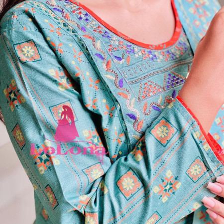 Stitched Three Piece Code T-3012 স্লাব কটন থ্রিপিস । গলার ডিজাইন ও পুরো বডিতে স্ক্রিনপ্রিন্টের কাজ করা। প্রতিটি থ্রিপিস সুন্দর ডিজাইনের এবং বানানো কামিজঃ সাইজ ঃ ৩৮,৪০=XL এবং ৪২,৪৪= XXL লং ৪৫ ইঞ্চি